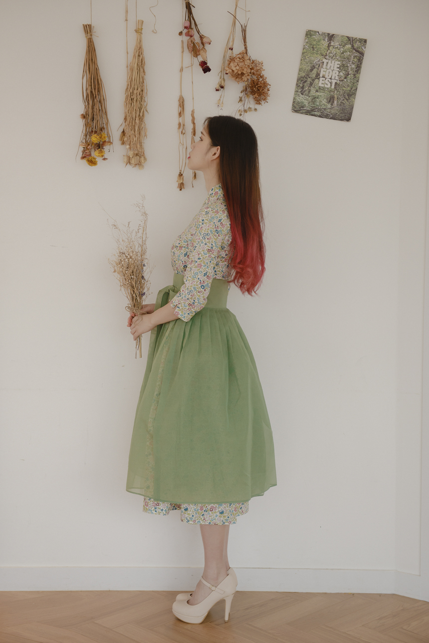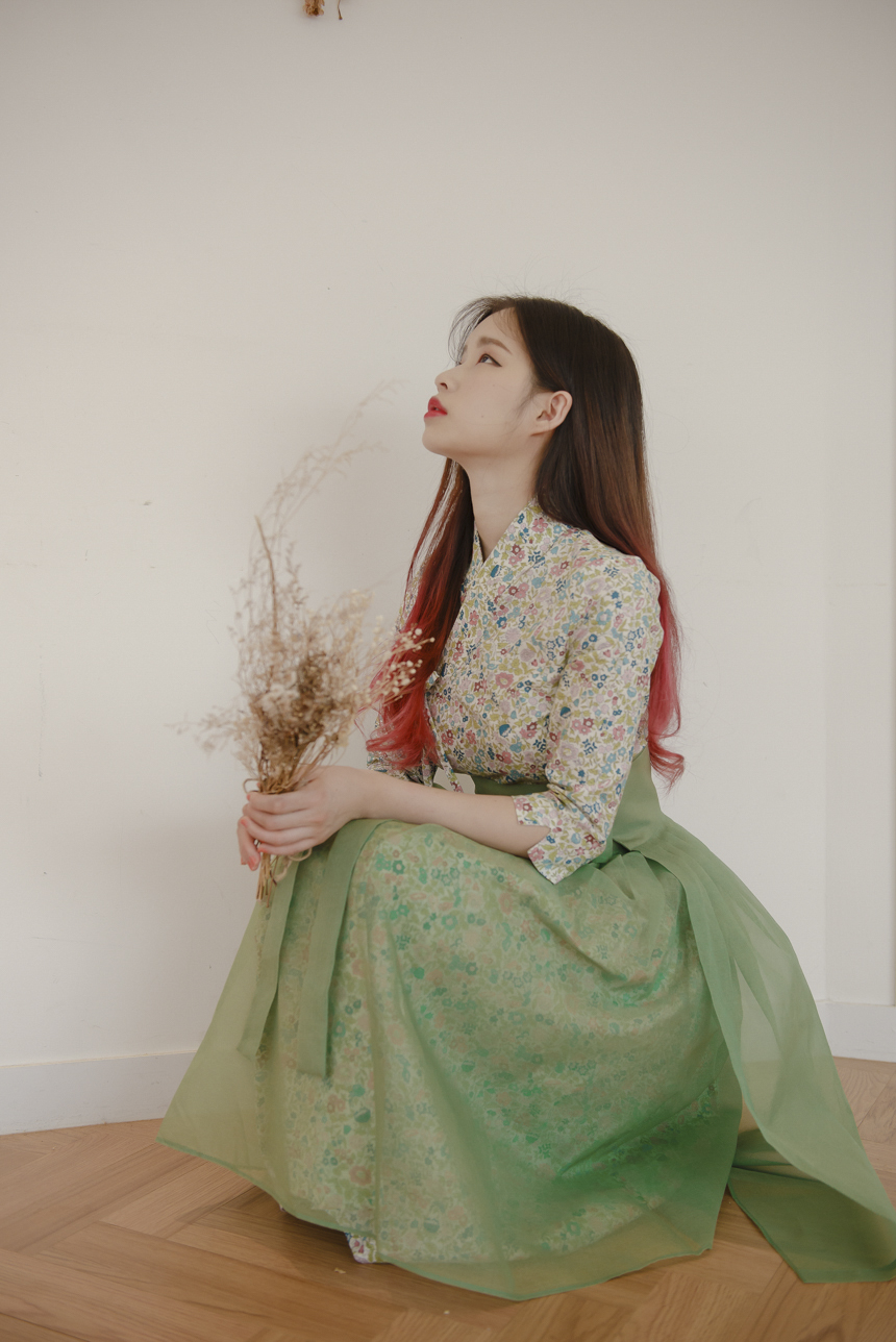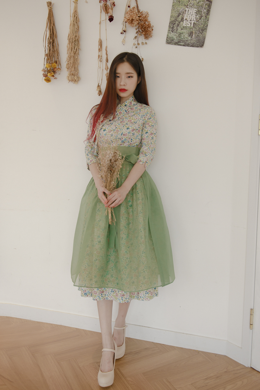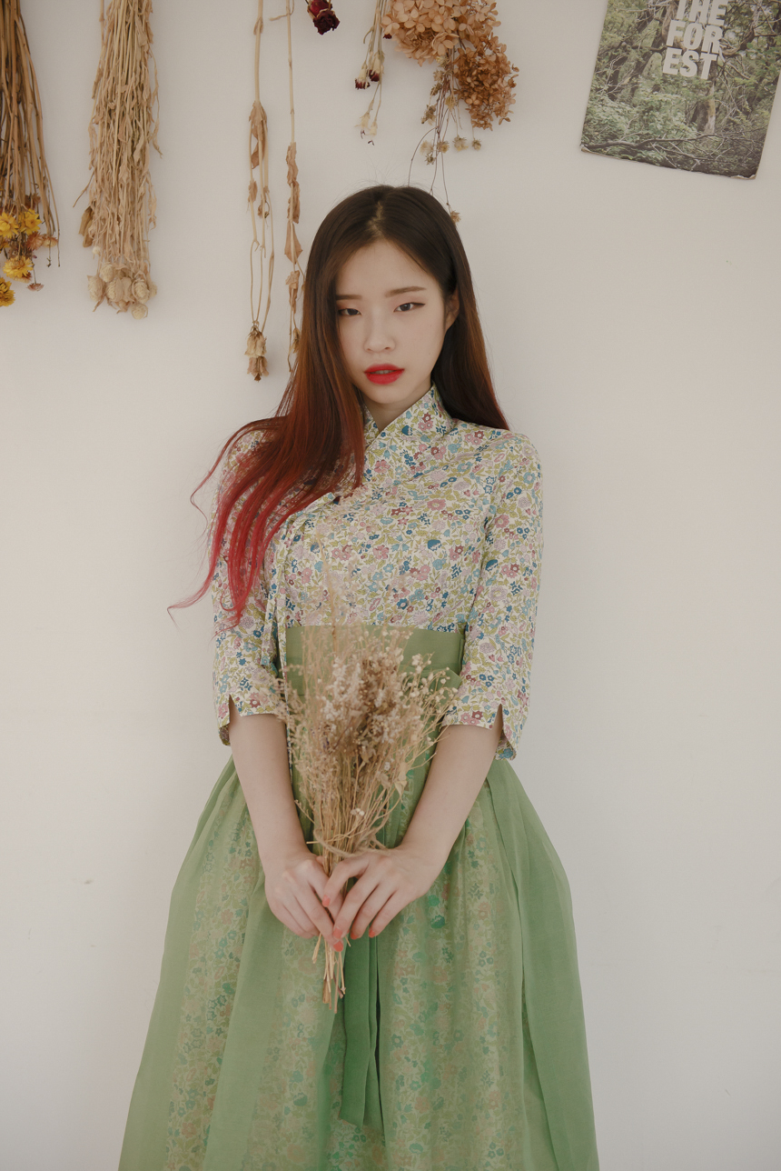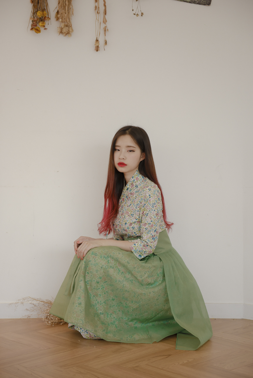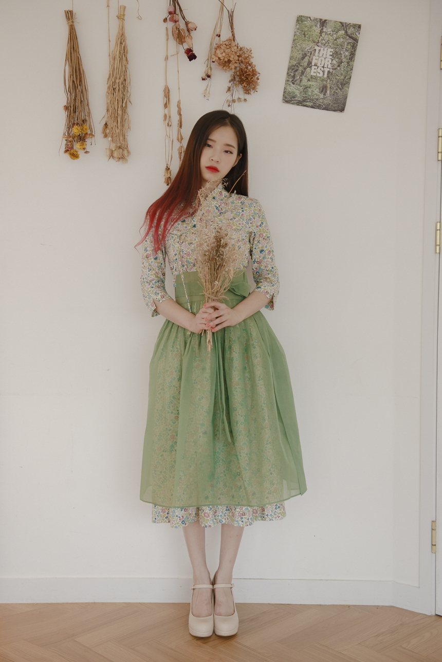 허브 연두색 한복원단 허리치마를 함께 코디해서 입으시는 꽃닮의 특별한 생활한복입니다.