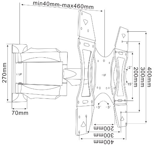 - Feature : Max VESA: 400x400mm. Compatible VESA Dimensions: 100x100; 100x200; 200x200; 200x300; 250x 400; 200x 400; 300x 300; 300x400 & 400x400mm / Low Profile 40mm from wall. Arm extends to 465mm from wall / Strong 88lb (40Kg) load capacity / Tilt: 15° (up & down) / Quick and easy to install - bracket comes complete with full instructions and required fitting hardware
