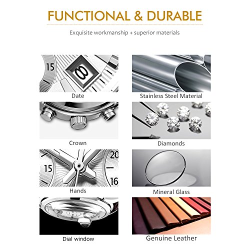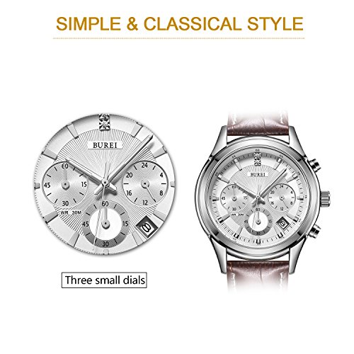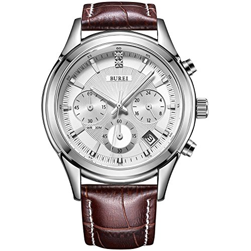 (《바오쇼》)BUREI 손목시계 맨즈 크로노그래프 날짜 시계 브라운소 우가죽(껍질) 레더 화이트 문자판 실버 케이스