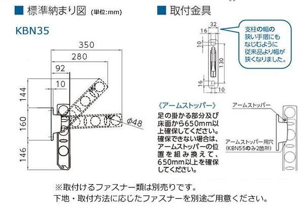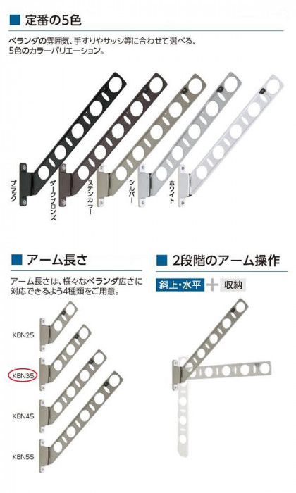 | 仕様 | 用途:腰壁取り付け用の物干し掛け 壁面からの出幅:使用時最大350mm/収納時92mm 耐荷重:30kg(1セットあたり) 取り付けに必要な道具:電動ドリル、プラスドライバー |