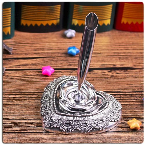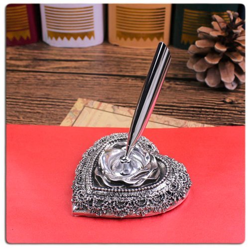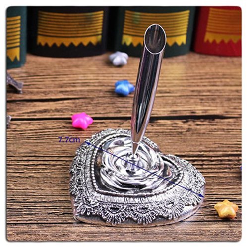 Chris-Wang Desktop Pen Holders Feather Dip Lik Penholder Signature Quill Stand Stationery Gift for Wedding Party, Hearted Shape Retro Resin Base(Silver)