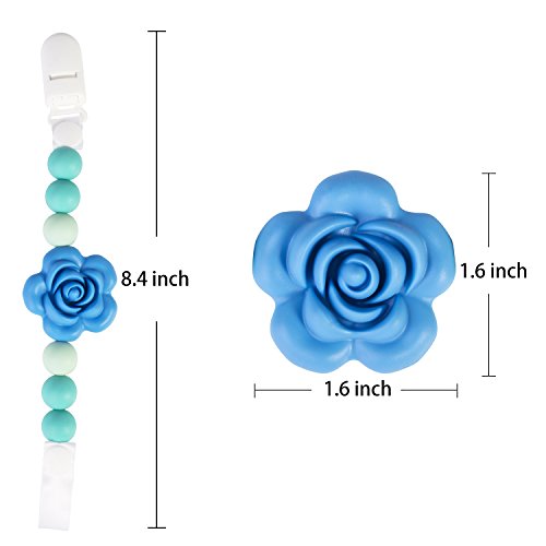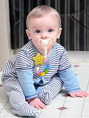 -. Feature : This teething chain 100% BPA free and made of food grade silicone,safe for child teething period to chew and hold / Ease the pain of teething gums in infants.Help the newborn babies solve first tooth pain.Can also clean the baby's mouth / Easy for moms to clean up,teething beads can be wiped clean with soap and water or sterilized in boiled water,no more worries about nasty germs or dirt / The universal pacifier clip is very simple to use.To attach,simply bend the clip at the base,clips to bibs clothes,stroller and car seat straps with ease,can even be used one handed / The teether beads passed the FDA,EN71 test,and approved the Australia,Canada standard.Colorful design can catch baby's eyes make your baby love to use it,good to help baby's gingiva and mandible growth