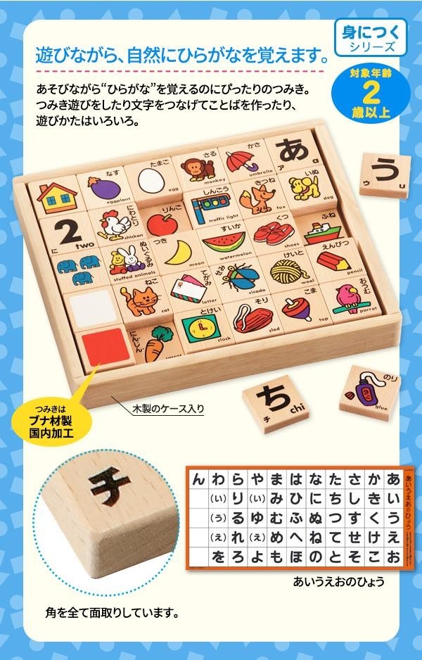 | セット内容 | つみき60枚(「あ」~「ん」のつみき46枚、「すうじ」10枚、「色」4枚)、あいうえおのひょう、ガイドブック、木箱 |