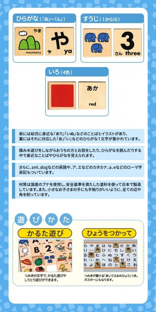 ひらがなに興味をもち始めたお子さまが遊びながらひらがなを覚えるのにぴったりの積み木です。 |