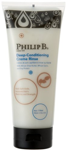 ReleaseDate : 2007-10-10 Studio : Philip B Publisher : Philip B Binding : Health and Beauty Product Description With African Shea Butter, Wheat germ, and Soy Protein. Seals split ends, increases hair's elasticity and strength. Philip B Botanical Deep-Conditioning Creme Rinse is made of pure African Shea Butter and a blend of pure plant and flower extracts. Shea Butter, containing a natural UV protection, was used for centuries by the natives of the Ivory Coast and Senegal to heal and protect. Philip B Deep-Conditioning Creme Rinse leaves a fine seal of pure protein on the hairshaft to volumize, moisturize and detangle the hair. Philip B Deep-Conditioning Creme Rinse adds shine and body to the hairshaft while nourishing each strand with permanent conditioning, even after successive shampooing. Made in USA. 0