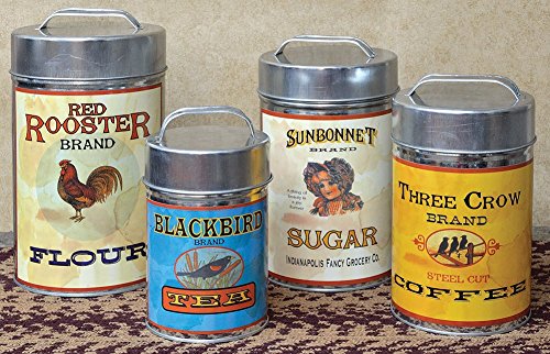 Food safe tin containers feature old time labels. 4 canisters range from 7-1/4" to 10-1/4" high