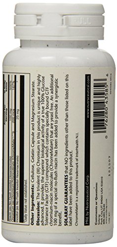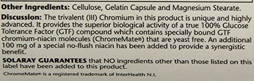ReleaseDate : 2015-03-19 Studio : Solaray Publisher : Solaray Binding : Health and Beauty Product Description The trivalent (III) Chromium in this product is unique and highly advanced and provides the superior biological activity of a true 100% Glucose Tolerance Factor (GTF) compound which contains specially bound GTF chromium- niacin molecules (ChromeMate) that are yeast free. 0