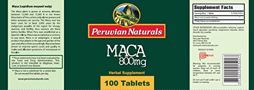 800mg of Maca root powder per tablet, 100 tablets per bottle.