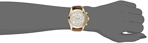 - Feature : Chronograph functions with 60 second, 60 minute and 24 hour sub dials; date window between 4:00 and 5:00 / White mother of pearl dial with gold tone and white hands and hour markers; luminous; mineral crystal; screw-down crown and pushers; 18k gold ion-plated stainless steel case; light brown patent leather strap / Japanese-quartz movement / Case diameter: 42mm / Water resistant to 660 feet