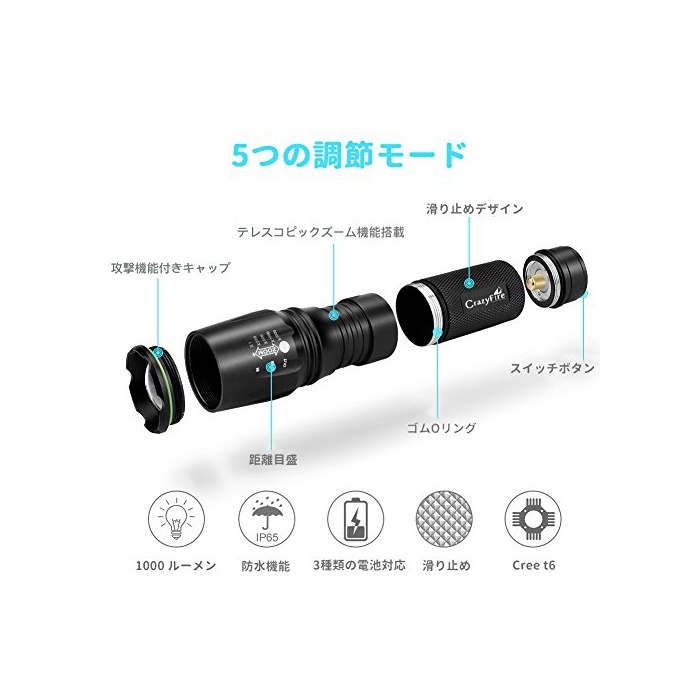 원본상품명: CrazyFire ?中電? ズ?ム式5モ?ド 1000LM CREE XM-L T6LED ポ?タブル ?41865026650??