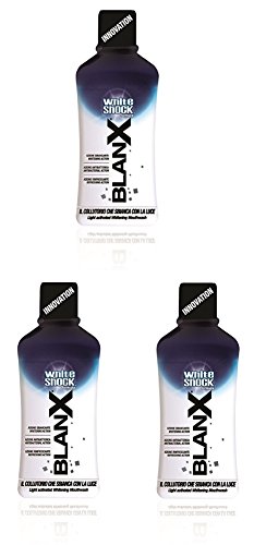 -. Binding : Health and Beauty -. Brand : BlanX -. EAN : 8017331044612 -. Feature : Shake before use / make your teeth whiter ! and more ! it removes the bacteria that cause plaque and cavities. / Actilux helps maintain your gums healthy and hydrated / Use BlanX White Shock Mouthwash with Actilux at least once a day for 30 seconds using the cap as a dispenser. / Made in Italy - Italian Packaging - English instructions -. IsAdultProduct : 0 -. Label : Cosswell SPA -. Manufacturer : Cosswell SPA -. MPN : 8017331044612 -. PackageQuantity : 3 -. PartNumber : 8017331044612 -. ProductGroup : Health and Beauty -. ProductTypeName : HEALTH_PERSONAL_CARE -. Publisher : Cosswell SPA -. Studio : Cosswell SPA -. Title : Blanx White Shock Mouthwash 500 ml Pack of 3