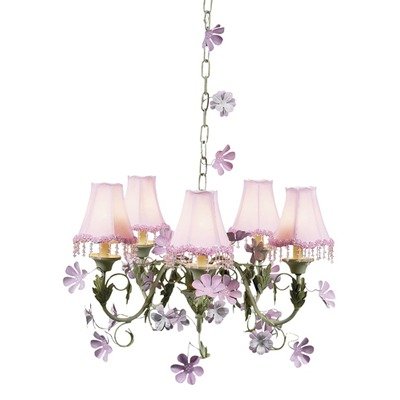-. Title : Jubilee Collection 929009-2507-305 5 Arm Pink/Green Leaf & Flower Chandelier with Scallop Drum Green Shade and Sash