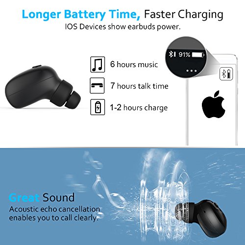 6-Hour Playtime: So Small, So Powerful! 50mAh rechargeable lithium-ion polymer battery, up to incredible 7 hour continuous talk time or 6 hour music time(60% volume) on a full charge around 1-2 hours; Support IOS DEVICE POWER DISPLAY.