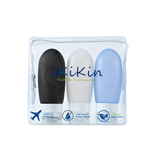 iKiKin Silicone Travel Bottles(3oz 89ml), Leak Proof, TSA Approved, Squeezable Containers Set with Zipper Bag (3oz/89ml Blue/White/Black + Bag)