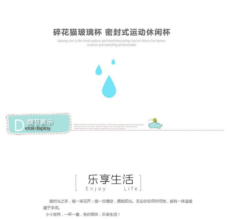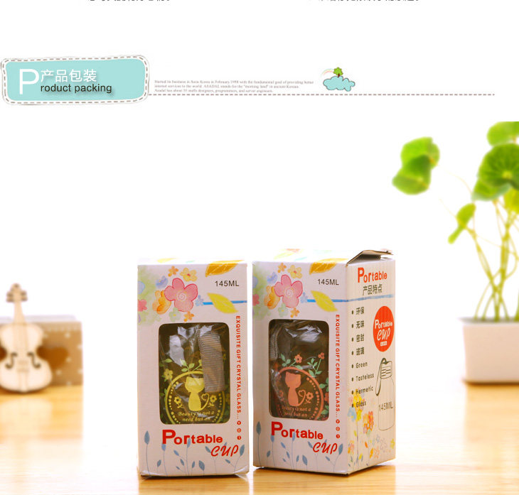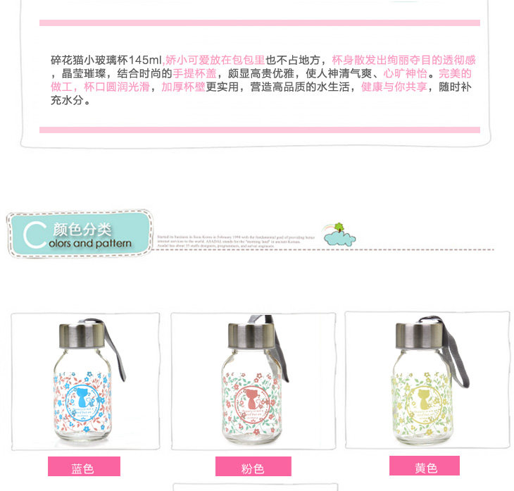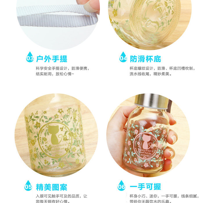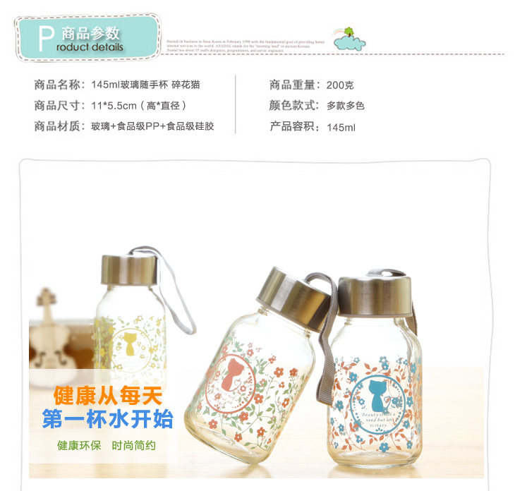 | Product Description | Floral cat small glass 145ml, small floral transparent glass sealed lid, outer and inner stainless steel food grade PP from a system of hand-tighten the lid, embedded silicone ring, good sealing, easy to carry, the cup rounded and smooth mouth, drink more comfortable, the thread to create consistent and lid, tighten the lid will not spill, exquisite glass cup as monotonous increase in the unlimited fun, cute little nor on the bag of space, but also on the clothes going round any time to add moisture, very convenient oh! |