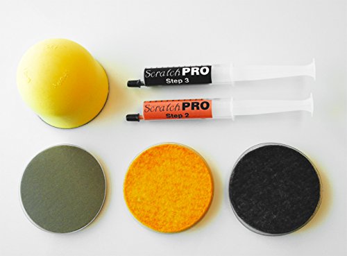 Quick and Easy 3-step Scratch Repair Process: Step 1 - Scratch Pro Sandpaper; Step 2 - Orange Scratch Pro Buffing compound; Step 3 - Black Scratch Pro Polishing compound.