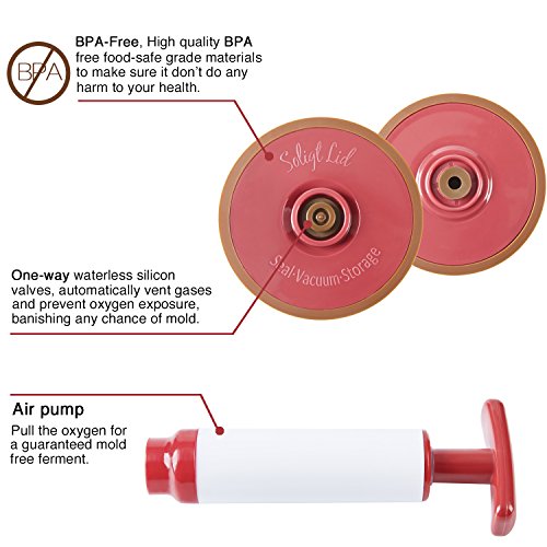 Studio : SOLIGT Publisher : SOLIGT Product Description Soligt Makes Fermentation Easy We are a company dedicated to healthy living and eating, so you can trust that our fermentation supplies do what we say they do! These lids along with the included extractor pump are essentials for experts and novices alike who are looking to take advantage of all the benefits fermented food can offer. Many competitive products do ok, but no other is as reliable as our four-lid set. The reason is that they're specifically designed to keep out oxygen, while letting carbon dioxide escape. This ensures fermentation occurs without mold, bad bacteria or any other undesirables. Our lids are easy to use and work with all standard wide-mouth jars. A waterless airlock valve is a one-way breathable valve without any of the hassles of the conventional airlock. These lids are designed specifically for fermenting so you never have to deal with those clunky airlocks again. Enjoy fermenting cabbage, carrots, cucumbers, string beans, radishes and much more with great success! 0