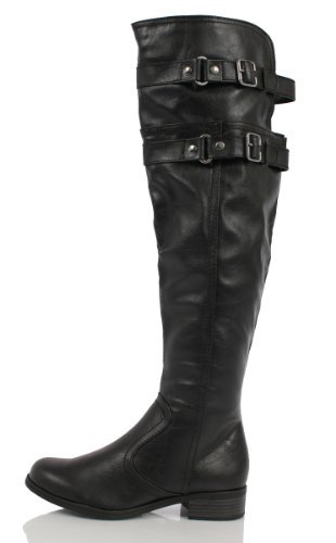 Binding : Apparel Product Description Black Leatherette over the knee flats features round toe, stitching detailing, double adjustable strap, open back, and low heels. Cushion insole with traction sole.Shaft height measures approximately 22" including heel. Opening circumference 16" and calf circum. 15" ( size 7) 0