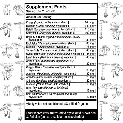 A BLEND OF 17 POTENT MUSHROOM SPECIES: A comprehensive formula designed to support natural immunity. This organic mushroom supplement contains multiple mushrooms including, but not limited to cordyceps, chaga, reishi, maitake, lions mane, and agarikon.