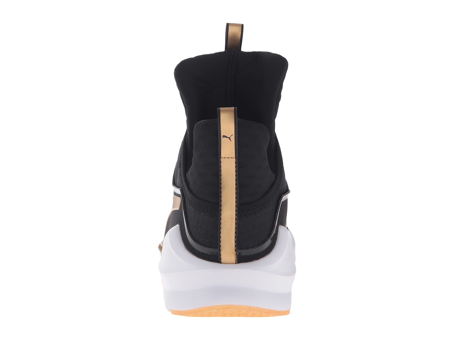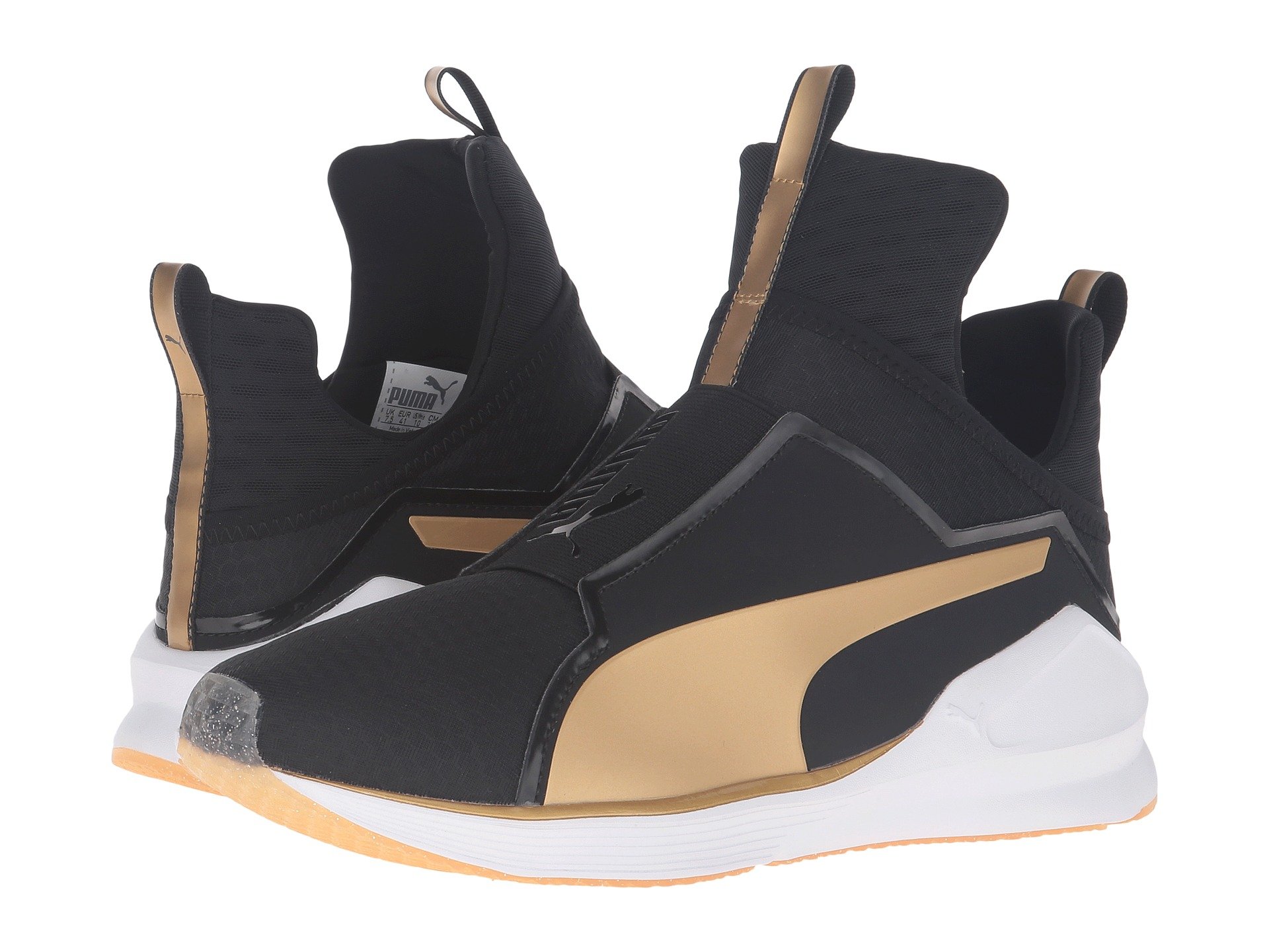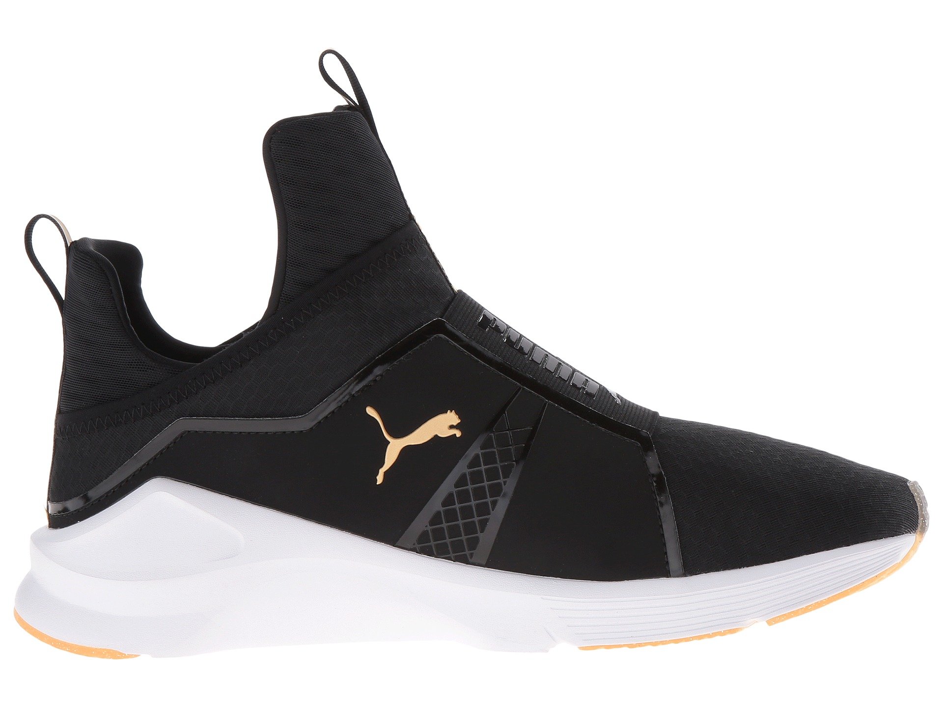 | Product Information SKU: #9036871Go for gold with the sleek Fierce Gold from PUMA?. Breathable mesh and synthetic uppers with a round toe.Slip-on bootie construction with pull-tabs at tongue and heel for an easy on and off.Extra-high tongue for added unique style.PUMA Cat Logo at medial side; PUMA Formstrip at lateral side.PUMA No. 1 Logo at midfoot.Breathable textile linings.Features internal flatlock stitching for reduced friction.Offers full-length flex grooves on outsole that provide dynamic multi-directional movement.Exaggerated thickness at heel, medial, and lateral sides for greater stability.Durable rubber outsole for added grip. Imported.Weight of footwear is based on a single item, not a pair. |
