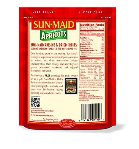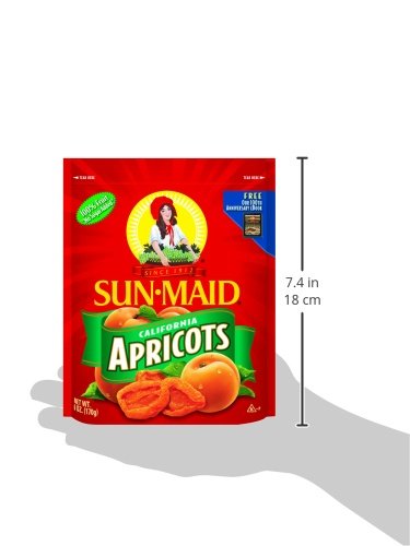 -. Binding : Grocery -. Brand : Sun Maid -. EAN : 0041143071700 -. Feature : Pack of four, 6-ounce per pouch (total of 24-ounces) / Ripened by the sun to the peak of flavor / Sun dried to perfection -. Label : Sun Maid -. Manufacturer : Sun Maid -. Model : California Apricots -. MPN : California Apricots -. NumberOfItems : 4 -. PackageQuantity : 4 -. PartNumber : California Apricots -. ProductGroup : Grocery -. ProductTypeName : GROCERY -. Publisher : Sun Maid -. Size : 24 Ounces -. Studio : Sun Maid -. Title : Sun Maid California Apricots, 6-Ounce Pouches (Pack of 4) -. UPC : 041143071700