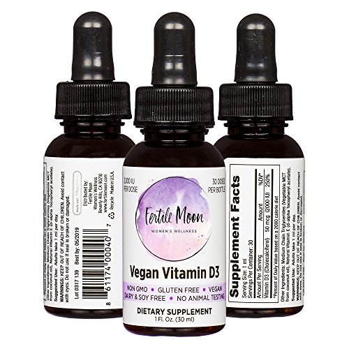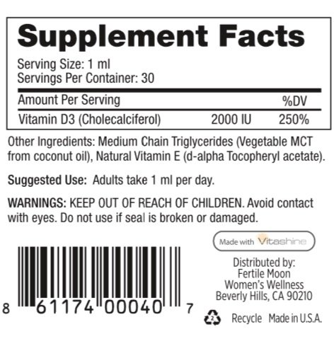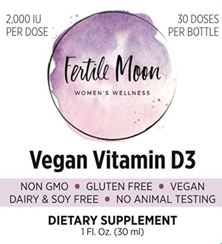 Liquid Vegan Vitamin D3 by Fertile Moon® is an easy-to-swallow flavorless liquid supplement formulated with strict vegetarians and vegans in mind. We source our vitamin D3 from lichen, a moss, rather than traditionally-sourced lanolin. Fertile Moon vitamin D3 is: non GMO, gluten free, vegan, dairy and soy free, and is not tested on animals. Symptoms of vitamin D deficiency include: depression, muscle pain, bone pain, tiredness, and subfertility. People at risk for vitamin D deficiency are: the elderly, overweight, and those with darker skin pigment. These statements have not been evaluated by the Federal Drug Administration.Feature