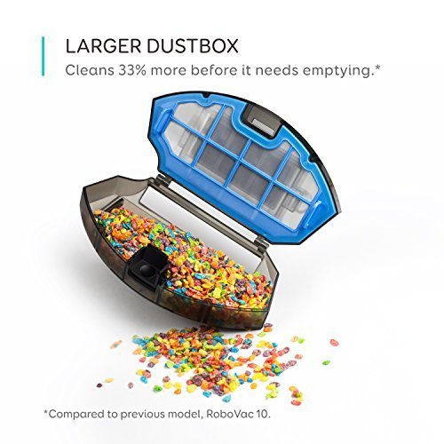 Cleans Further 33% larger dustbin* allows RoboVac to pick up more dirt and dust to take full advantage of the 1.5 hours of cleaning power the 2600mAh li-ion battery offers.