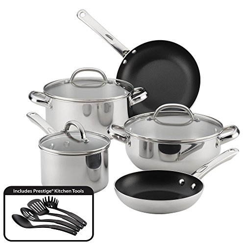 Ready, set, cook, with the convenient, long-lasting Farberware Buena Cocina Stainless Steel 10-Piece Cookware Set, including nonstick-suitable nylon cooking tools so cooking can start right away! Farberware Buena Cocina makes preparing and sharing favorite meals and family recipes fresh and easy. The dishwasher-safe cookware set features beautiful polished stainless steel exteriors and easy-to-clean brushed stainless steel interiors, to help make cooking a pleasure. Induction-suitable thanks to the full cap magnetized stainless steel bases, the set includes shatter-resistant glass lids on covered pieces. For quick and even heating, convenient food release, and speedy cleanup where it's needed most, the skillets feature aluminum construction with polished exteriors and long-lasting nonstick interiors. Step after step, generation after generation, home cooking and eating is goodness worth sharing, and Farberware helps home cooks share in that. This cookware set from Farberware includes larger-capacity pots and pans to ease meal planning and family cooking. The Prestige nonstick-suitable nylon cooking utensils are perfect for use with both nonstick and stainless steel interiors. The stainless steel cookware handles are double-riveted for strength and oven safe to 500 Degree. Cooking from the heart is always enjoyable, and with the Farberware Lifetime Warranty, your cooking and kitchen are set! For meals from basic to special, the durable, dependable Farberware Buena Cocina Stainless Steel 10-Piece Cookware Set cooks with and for you and your family.Feature