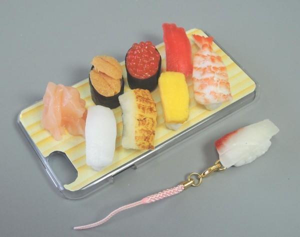 | 豪華な一皿。ミニチュアのうに、いくら、まぐろ、えび、いか、あなご、たまご、はまち(ストラップ)の盛り合わせがついたiPhone6ケースです。 |