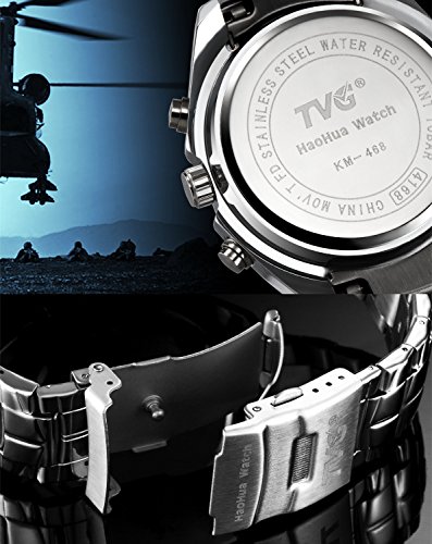 TVG LED sport watch features digital movement for displaying time. The watch adopts quartz movement which can guarantee a durable and accurate time. The special function of water resistance and stainless steel will give convenience to your life as you needn't take it off when you wash hands or face(but not for swimming or diving). It will be a good gift for you and your lover. And also it will be a good life companion. It is a nice choice to buy this fashion and practical watch.