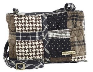 Binding : Apparel Product Description The Essentials from our Carrington Collection features a patchwork tonal palette of espresso, stout black, cinnamon and butternut creme that echoes the deep, soothing richness of the country. The wallet compartment is lined in brown nylon, and all stress points are reinforced. Measuring 7.50x2.5x5.5" the Essentials features 1 adjustable shoulder strap with a handle drop of 24" and 2 outside slip pockets on the front. The outside wallet zip pocket includes 7 credit card slots, 1 checkbook/money pocket and 1 ID window. Hang tag gives all product specifications for retail display. New features include an antique finished metal embossed logo on the front, as well as an antique finish zipper pull with embossed Bella Taylor logo for the YKK metal zippers Packaged individually in a self sealing poly bag with Child Safety and UPC sticker. 0