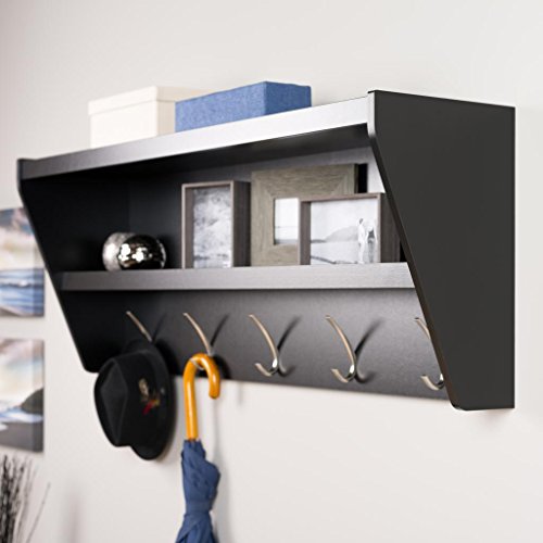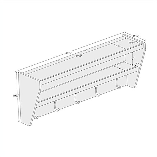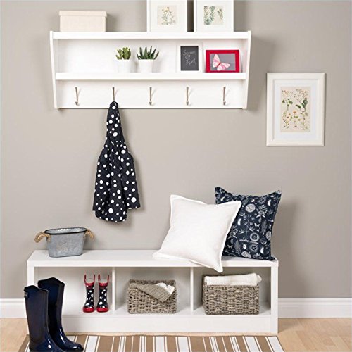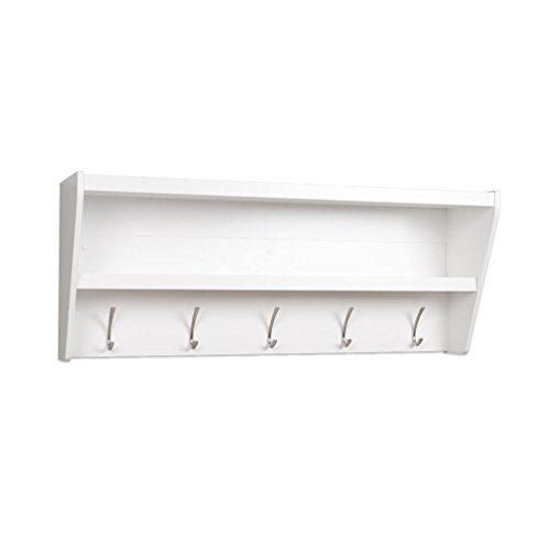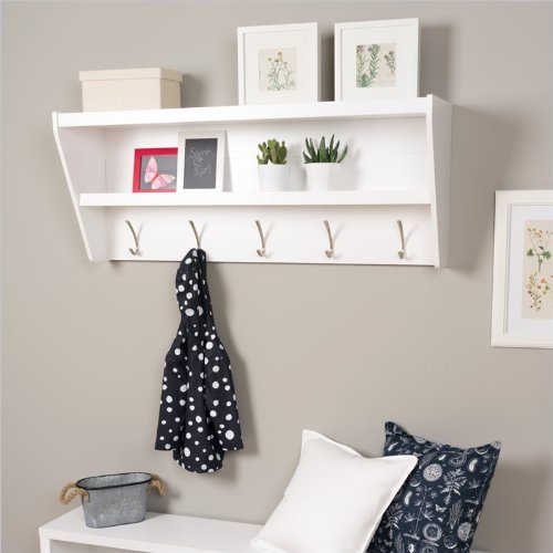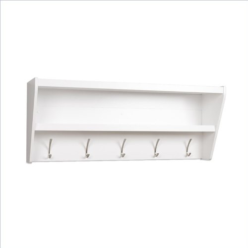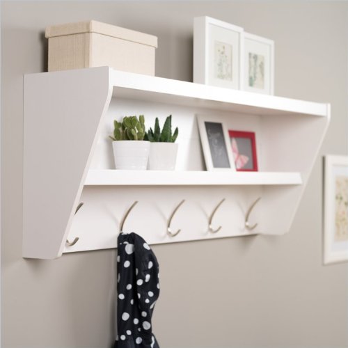 Studio : Prepac Publisher : Prepac Binding : Kitchen Product Description Outfit your foyer with a smart and stylish storage solution, ready for anything your family can throw at it.? This modern shelf features 5 solid metal hooks that provide a perfect perch for coats, hats, and other entryway essentials. ?Open design shelves provide a handy spot to drop your keys, purse, wallet or to display decorative items. This product ships Ready To Assemble and includes an easy to follow instruction booklet. Our innovative hanging rail system includes all mounting hardware which makes installing at any height a breeze.? Proudly manufactured in Canada using composite woods and finished with durable laminates. Features: Finished in Durable Pure White Laminate 5 Solid Metal Hooks Easy to install two-piece hanging rail system and mounting hardware included Constructed from CARB-compliant, laminated composite woods Ships Ready to Assemble Includes an instruction booklet for easy assembly 5-year manufacturer's limited warranty on parts Proudly Manufactured in Canada Specifications: Overall Dimensions: 19.25" H x 48.5" W x 11.75" D Weight Capacity: 50 lbs 0