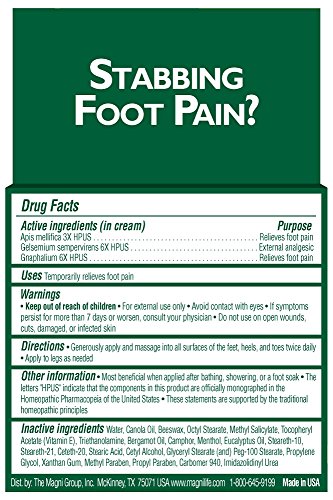 ReleaseDate : 2016-03-23 Studio : Magni Co. Publisher : Magni Co. Binding : Health and Beauty Product Description Stabbing Foot Pain? Intense, moisturizing treatment developed for severely dry, cracked, itchy, and painful skin on the feet. Calms the shooting, stabbing, burning, and tingling sensations. Helps soften hardened, callused skin to eliminate painful cracks and fissures. 100 percent safe to use between the toes. Formulated with quick absorbing moisturizers and other healing, nourishing ingredients. 0