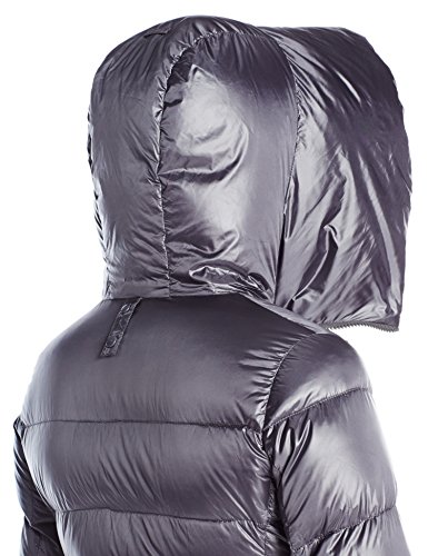 Goose down padded coat in metallic finish featuring folding collar-hood, internal drawstring waist, and concealed zip front