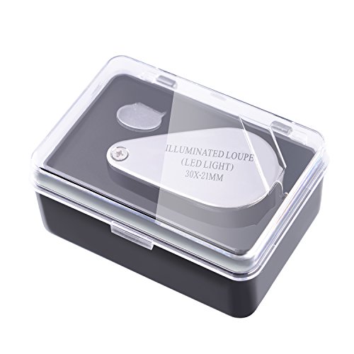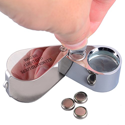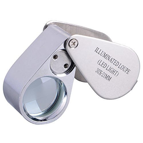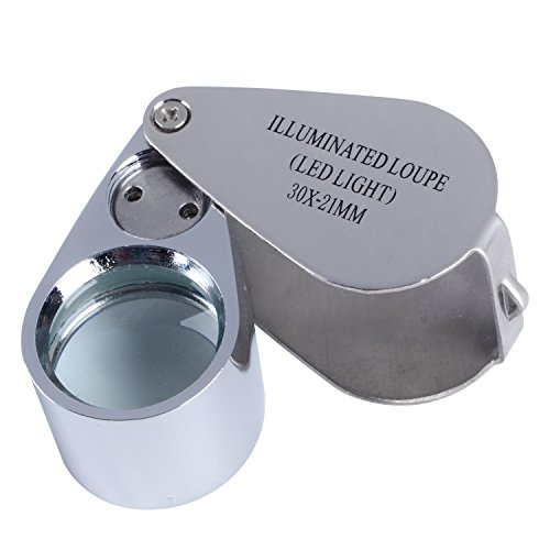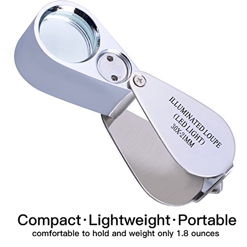 This 30X magnifying glass Illuminated Jeweler Loupe is built from durable metal with an optical glass that is 21 mm in length and has a dual bright LED light.