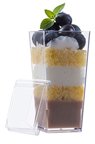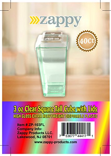 Zappy Elegant Tall Square Mini Cube 3oz Clear Plastic Tasting Sample Shot Glasses Parfait Souffle Jello Mini Dessert Cups Dessert Glasses 3 oz Shooter Tumbler Party Cups Bowls "With Lids" (40 Ct)