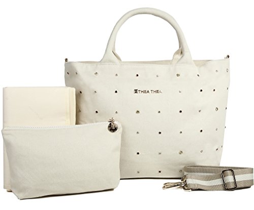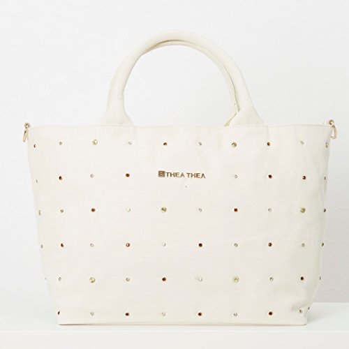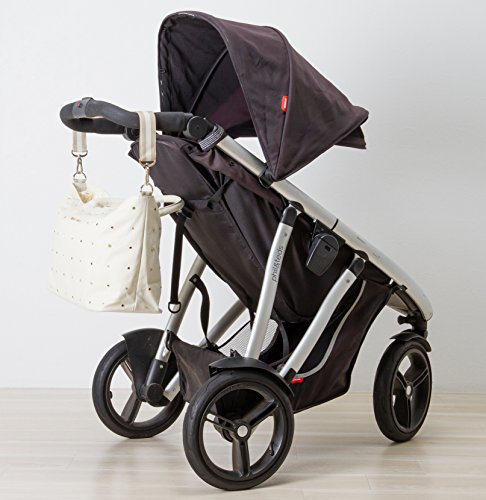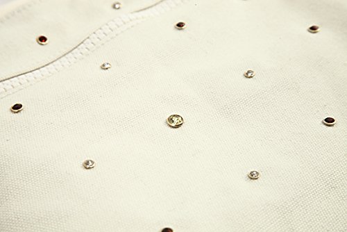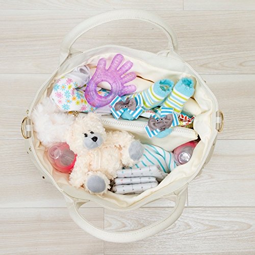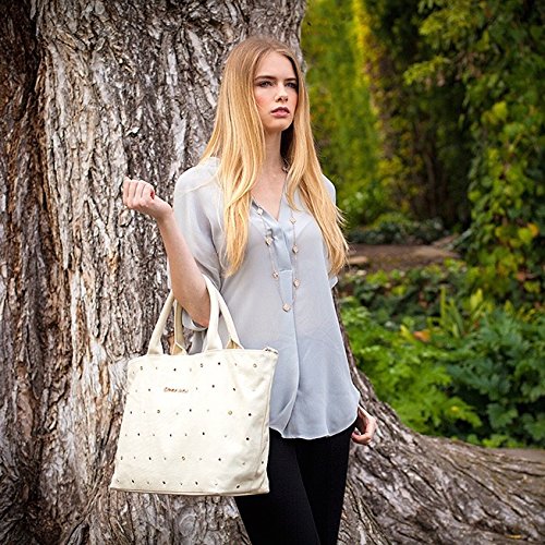The MADISON diaper bag is made with durable, lightweight canvas embellished with jeweled studs. It features 5 inner pockets- 2 bottle pockets, 2 small side pockets, and 1 medium netted pocket. An 11-inch interior key chain strap makes locating your keys a breeze, and the zippered outside pocket is a convenient cell phone holder. It comes with a matching pouch, a padded changing mat, and a stylish two-tone detachable shoulder strap.Feature