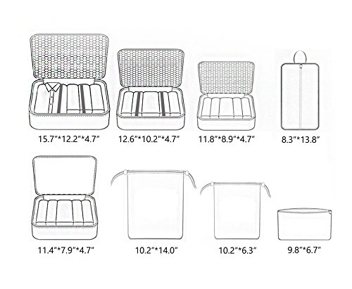 The sizes of the 8 bags(15.7*12.2*4.7)in,(12.6*10.2*4.7)in,(11.8*8.9*4.7)in,(11.4*7.9*4.7)in,(10.2*14.0)in,(8.3*13.8)in,(10.2*6.3)in,(9.8*6.7)in