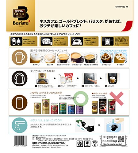 -. Binding : Kitchen -. Brand : Nescafé -. Color : black×white -. EAN : 4902201412360 -. Feature : ● using commodity refill only usual in the home , such as " Nescafe Gold Blend " and " Nescafe Eco and system pack" , to enjoy with a simple button operation and a café menu of five cappuccino and espresso " Nescafe Gold Blend varistor " can be " home coffee machine ● coffee menu of five with a simple button operation : black coffee latte , cappuccino , size of the mug , black coffee , espresso type coffee ● Milk is also bubbled fluffy hot water jet ● correspondence product : ( roasted Tanrei in / mellow roasted mellow depth of flavor ) Nescafe President & eco system pack , Koumibaisen Nescafe , Nescafe Gold Blend Eco and system pack ● The product can not be used : it is not possible to use eco- system and pack bagging and bottle , regular coffee, Nescafe Ekusera ● To help you drink more delicious , it is equipped with a warm cup mode ● The auto power off function in about 5 minutes , no worry of forgetting to turn off the power ● It is easy to be part decomposition , it became easy to care Product Description ● 359mm height 176 × depth 285 × dimensions / width ● Mass / 3.6kg ● tank capacity / 0.8L ● Function / 15 atm high-pressure pump , auto power off function in about 5 minutes ● thermal insulation pot type / not applicable ● Rated power / AC100V, 50/60Hz, 1460W ● unit / one ● Manufacturer Part Number / 12226447 I can enjoy it more delicious easy coffee usual . Coffee machine that can make coffee menu of five gold easily blend , Koumibaisen , eco- system and pack the President I can enjoy more delicious and easy menu of five types of coffee always . -. Model : PM9631 -. MPN : PM9631 -. PackageQuantity : 1 -. PartNumber : PM9631 -. ProductGroup : Kitchen -. ProductTypeName : KITCHEN -. Title : Nescafe Gold Blend "Varistor" White Color