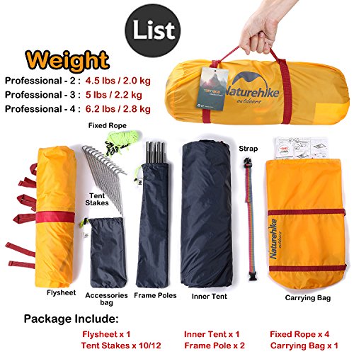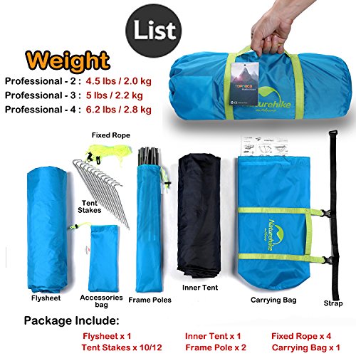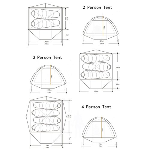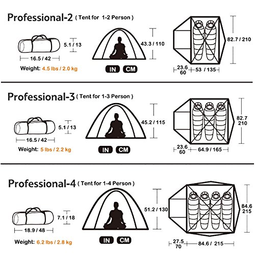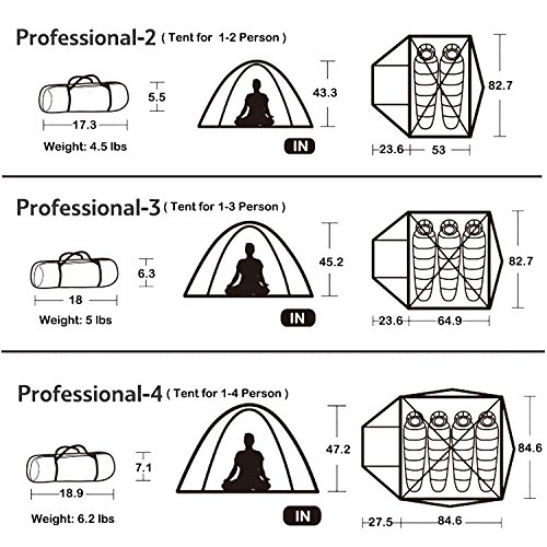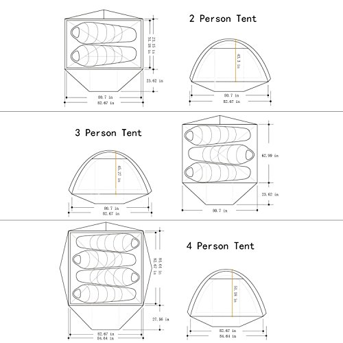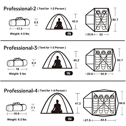 Specifications: - Unfolding Size: 7.1'x7.1'x4.3'(4P) / 6.9'x5.4'x3.8'(3P) / 6.9'x4.5'x3.6'(2P) - Folding size: 17.3"x6.3"x6.3"(4P) / 16.5"x5.9"x5.9"(3P) / 15.5"x5"x5"(2P) - Capacity: 1-2 Person (2Person); 2-3 Person (3Person); 3-4 Person (4Person) - Weight: 6.2 Pounds(4P) / 5 Pounds(3P) / 4.5 Pounds(2P) - Tent structure: dual doors and dual layers