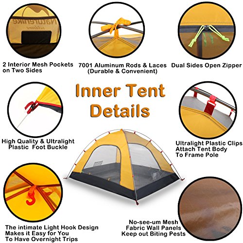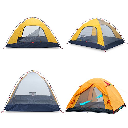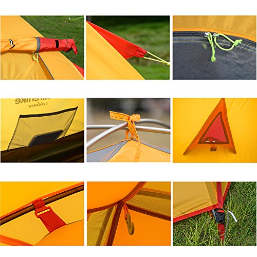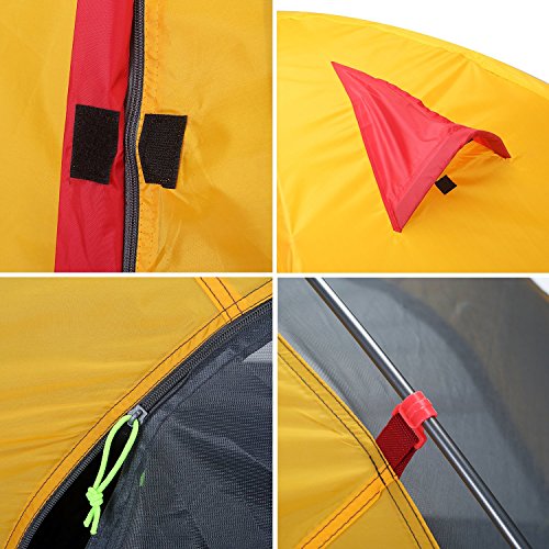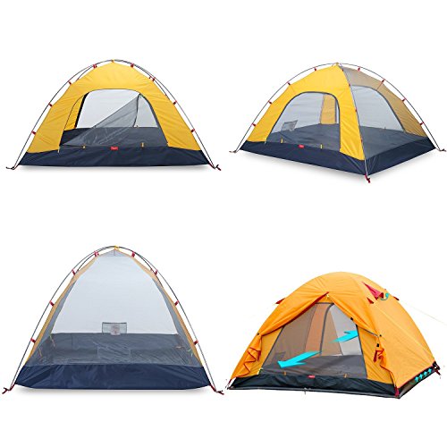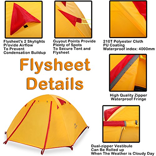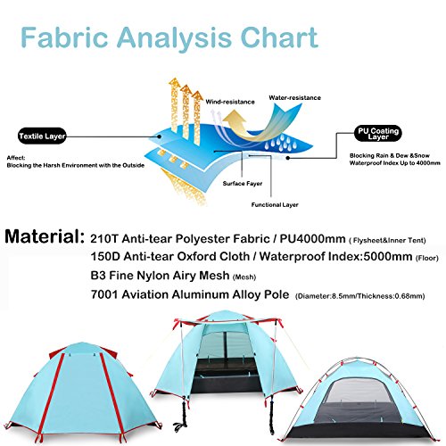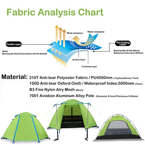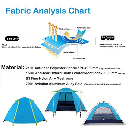 Fabric: - Inner tent: 210T polyester cloth and B3 Nylon airy mesh - Flysheet: 210T polyester cloth PU Coating / waterproof index: 4000mm - Groundsheet: 150D anti-tear Oxford cloth / waterproof index: 5000mm - Frame poles: 7001 high quality Aluminum / diameter: 0.335