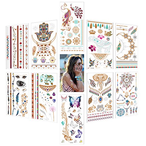 10 Sheets Metallic Temporary Tattoos for Women Body Makeup,150+ Designs Flash Temp Glitter Tattoo, Gold Silver Fake Shimmer Jewelry Tattoos,...