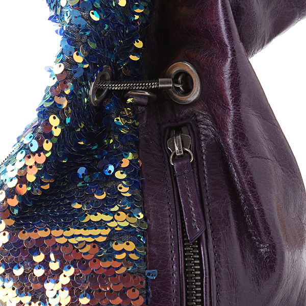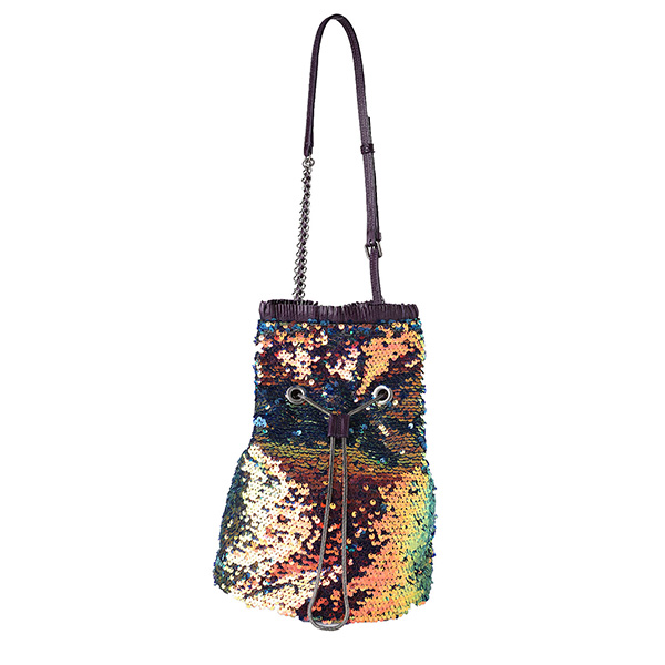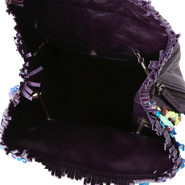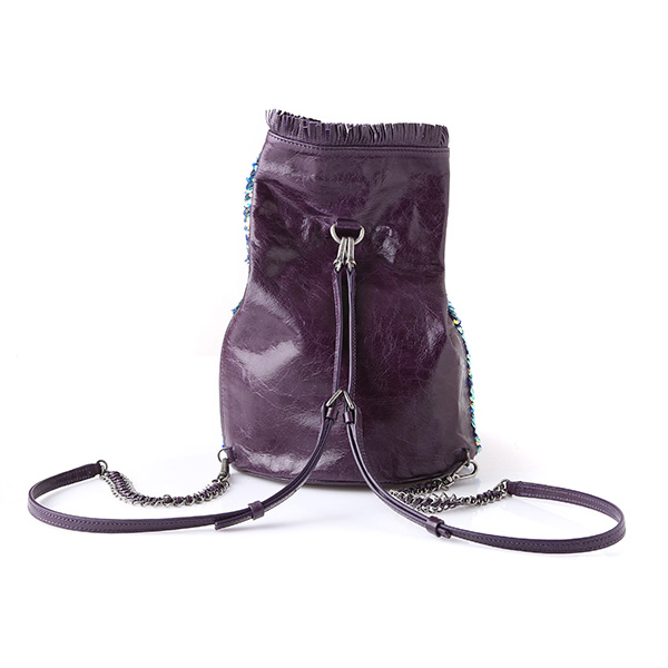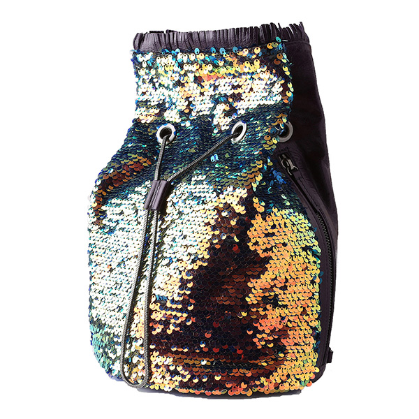 캐주얼 하면서도 페미닌한 백팩 겸 숄더 백입니다. 백팩으로 착용 가능하며 어깨끈의 고리는 탈부착 가능하여, 가방의 양 옆 D링에 걸었을 때는 숄더백으로도 사용 가능합니다. 이번 시즌 새로운 소재인 스팽글은 아래로 쓸어내리면 블루, 위로 쓸어 올리면 유광 블랙의 두 가지 컬러 연출이 가능합니다. 라미나또 블랙 가죽에 퀼팅으로 누빔을 한 스타일은 빈티지하며 여성스러움을 가지고 있습니다. 라미나또 가죽은 사용할수록 자연스럽게 꾸겨지고 크렉지는 것이 특징이며 이로 인해 사용할 수록 빈티지한 느낌이 강해집니다.