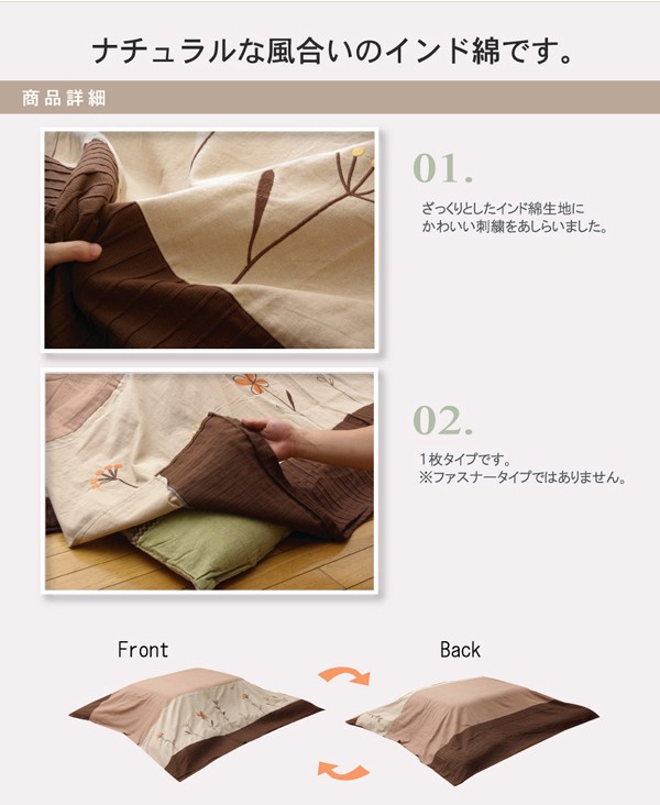 こたつの上掛けにぴったりなマルチカバーです。こたつの上掛け、ソファーカバー、カーペットカバーになど、いろいろな場面で活躍できる商品です。インド産の綿生地を使用しています。インド産の綿は繊維が太く、引っ掛かりや摩擦に強く耐久性に優れています。ざっくりとした生地で通気性が良く、気持ちのよい質感が特徴です。※本商品はファスナータイプではありません。
