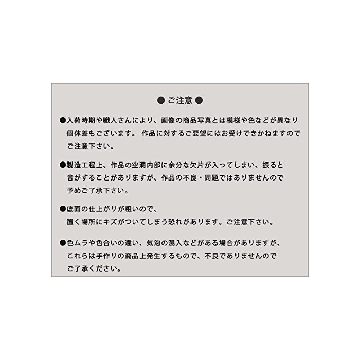 제조 공정상,작품의 공동 내부에 여분인 조각이 들어 가 끝,흔들면 소리가 일이 있지만 작품의 불량 문제 가 아니기 때문에 미리 양해해 주십시오.또한저면의(마무리)결과가 꺼칠꺼칠한 때문에,두는 장소로 상처가 들어(나) 버릴 우려가 있기 때문에,주의해 주십시오.