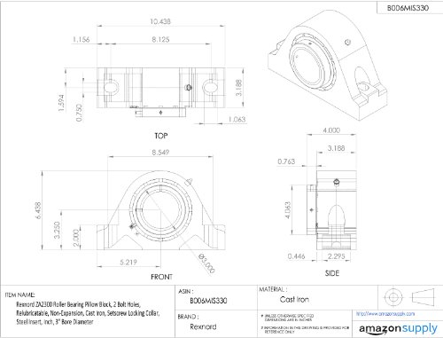 Rexnord ZA2300 Roller Bearing Pillow Block, 2 Bolt Holes, Relubricatable, Non-Expansion, Cast Iron, Setscrew Locking Collar, Steel Insert, Inch, 3" Bore Diameter