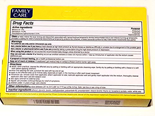 Studio : Family Care Publisher : Family Care Binding : Health and Beauty Product Description Helps relieve the local itching and discomfort associated with Hemorrhoids. Temporarily shrinks Hemorrhoidal tissue and relieves burning. Temporarily provides a coating for relief of anorectal discomforts. Temporarily protects the inflamed, irritated anorectal surface to help make bowel movements less painful. 0