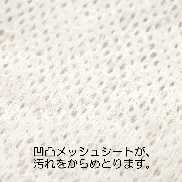 ●コットンメシュシートの凹凸がお口の汚れをやさしくふきとります。
