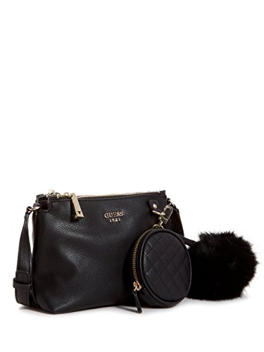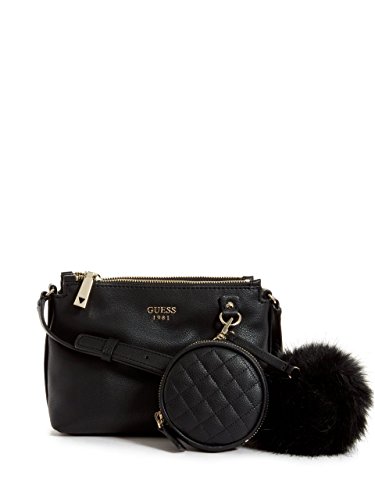 Pebbled faux-leather crossbody features removable quilted coin purse and faux-fur pom. Gold-tone hardware. Adjustable crossbody strap, two top zipper pockets and snap-closure center.