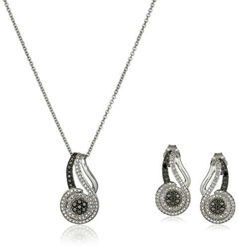 -. Binding : Jewelry -. Brand : Amazon Collection -. Color : White -. Department : womens -. Feature : Two-piece swirling pendant necklace and earrings set each featuring channel-set black and white diamonds / Necklace features rolo chain with lobster-claw clasp, earrings have post with friction backing / All our diamond suppliers confirm that they comply with the Kimberley Process to ensure that their diamonds are conflict free. / Imported -. Label : Amazon Collection -. Manufacturer : Amazon Collection -. Model : 37432/STGSIL/J1/SIL030RLO/STD -. MPN : 37432/STGSIL/J1/SIL030RLO/STD -. PackageQuantity : 1 -. PartNumber : 37432/STGSIL/J1/SIL030RLO/STD -. ProductGroup : Jewelry -. ProductTypeName : FINEOTHER -. Publisher : Amazon Collection -. Studio : Amazon Collection -. Title : Sterling Silver with White and Black Diamond-Accent Box Jewelry Set